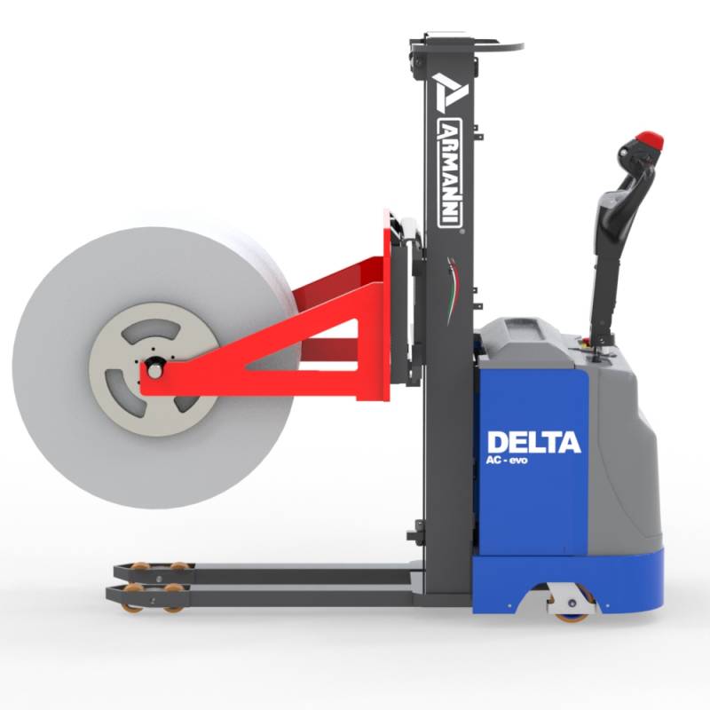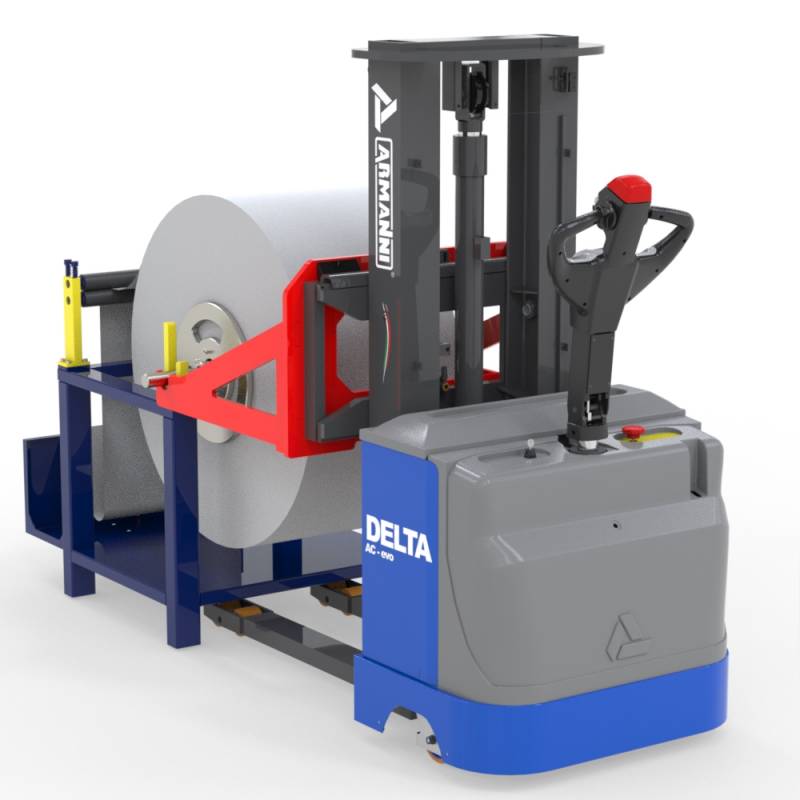 - Delta E FS je plně elektrický zdvižný vozík vybavený sedlovými V‑tvarovanými vidlicemi, navržený pro manipulaci s rolí prostřednictvím hřídele — zejména pro zakládání a odebírání rolí z odvíjecích strojů.